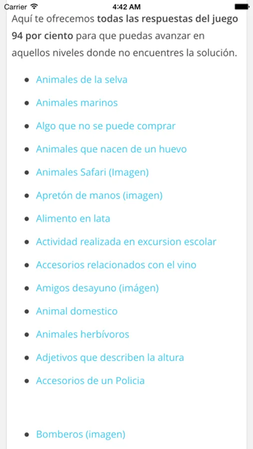 En esta aplicación encontrarás todas las respuestas para el juego 94%. La misma brinda las soluciones ordenadas en orden alfabético de forma que puedas encontrarlas más fácilmente, ya que el orden de los niveles de 94 por ciento son distintos en diferentes dispositivos.