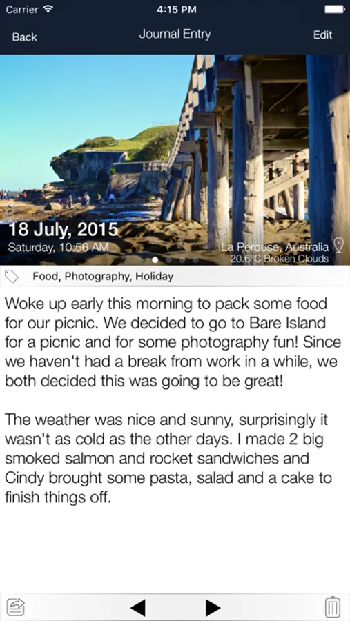Add a location to your journal entry, so you will always remember where the event took place. Records weather conditions for the location as well.
