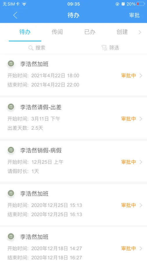 The approval section is divided into pending list and approved list. The pending list shows the applications that need to be processed by the current user, while the approved list shows the approved records for the current user.