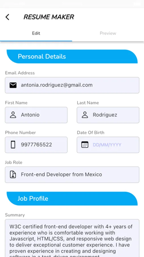 Resume Maker App lets create a simple, beautiful and professional resumes in minutes. It is so simple, quick to create a great resume in click. There is no any step-by-step process to enter your information in the fields.