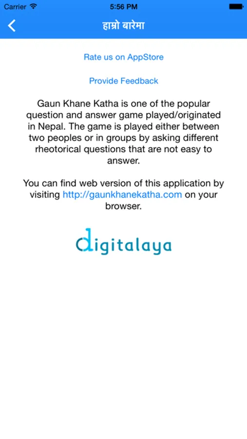 Gaun Khane Katha website and apps are created and maintained by Digitalaya. You can write your question and feedback at info@gaunkhanekatha.com.