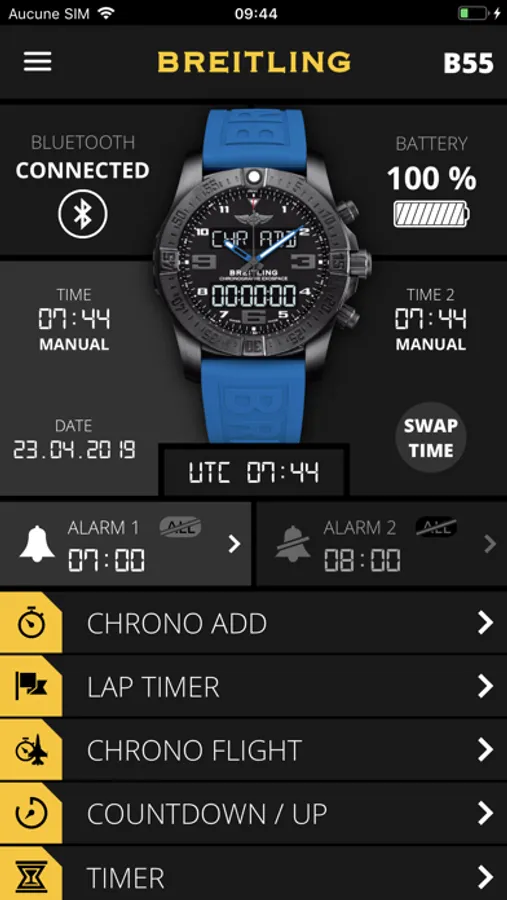 • Verify the state of your chronograph at just a glance and adjust your settings (UTC time, timezones, date, 7 alarms, synchronization of the hands, display.