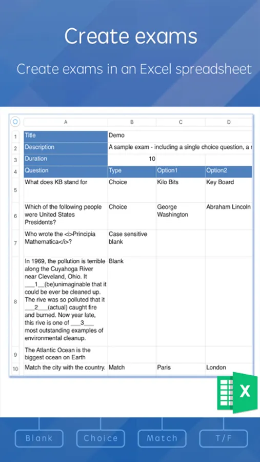 MTestM allows you to use Excel to write multiple-choice, fill-in-the-blank and matching questions in a simple format that can be imported. When creating a large numbers of questions, MTestM can provide a quick way of bulk importing questions.