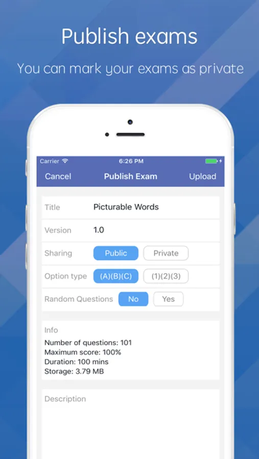 After you have created an exam, you can publish it. You can mark your exams as private if you do not want others to see your exams, otherwise your exam can be seen by others.