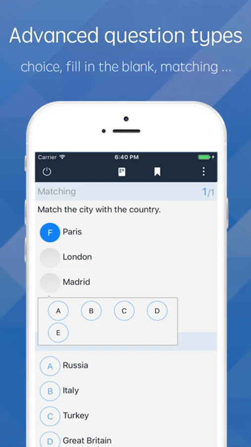 MTestM allows you to create single choice, multiple choice, fill in the blank and matching questions. MTestM supports case sensitive answers and questions having more than one correct correct answer.