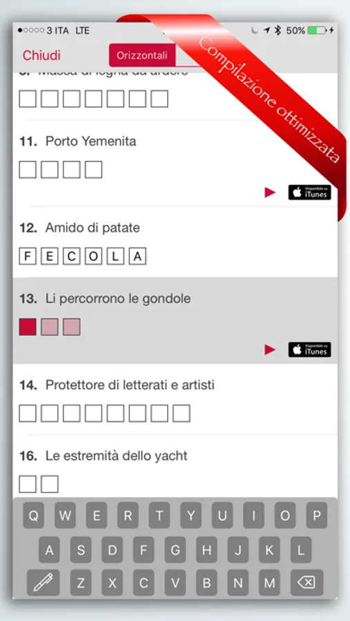 L’app presenta una interfaccia che si adatta allo schermo dell’iPad ed a quello dell’iPhone. Quando viene eseguita su iPhone è possibile inserire la soluzione direttamente nell’elenco delle definizioni oltre ad inserirle nel classico schema.