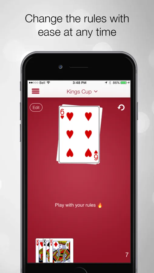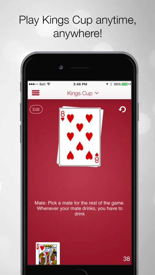 The Kings Cup App allows you to play the popular Kings Cup drinking game any time, anywhere, and without any cards! This app allows you and your friends to start a game instantly with no setup required.