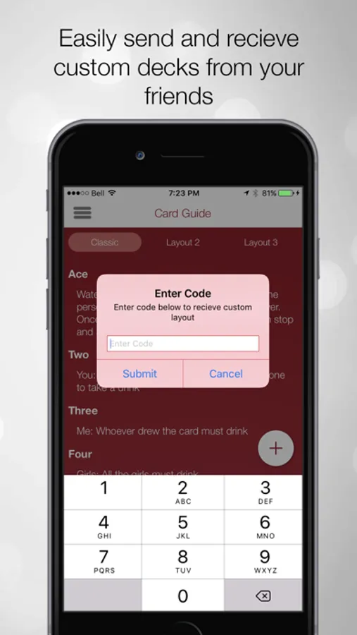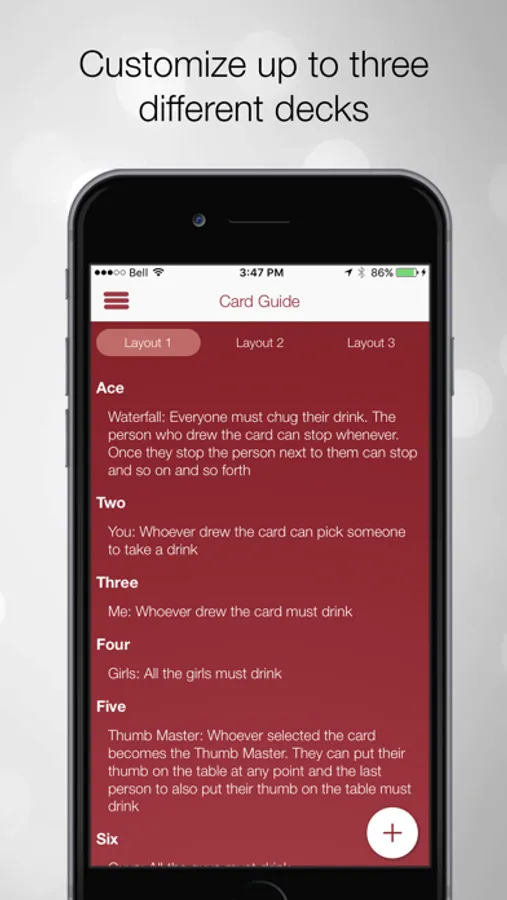 Card Guide: The card guide displays 3 different decks that are totally customizable. Have a deck with common rules, and one with your friends unique rules!