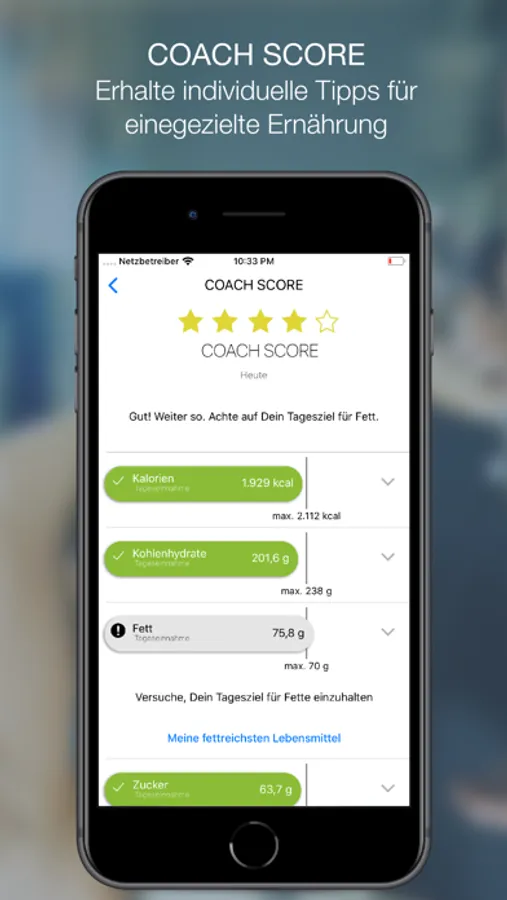 By using the calorie counter and diary the coach provides helpful tipps and suggestions for improvement. The food labeling makes it easy to see which food fits your diet goal.