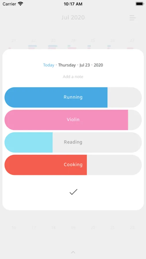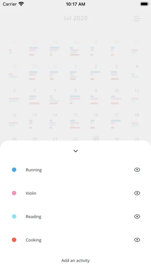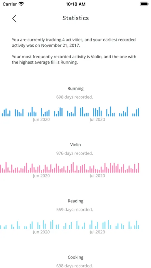 Easily track the activities that are important to you in a beautiful, colorful calendar. You can see your progress over time, and pinpoint which activities are going great, and which need some extra time commitment.