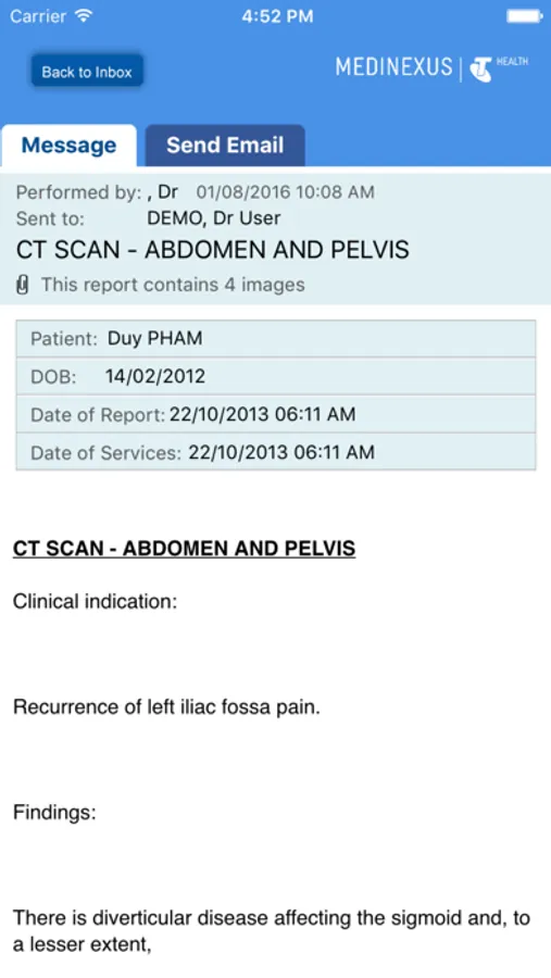 Medinexus Mobile for Patients allows you to view diagnostic reports of any studies as well as the images or attachments for these studies by clicking the 'View Images' button at the bottom of the report.