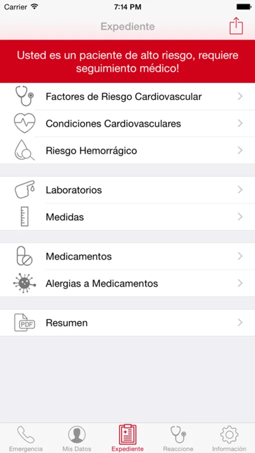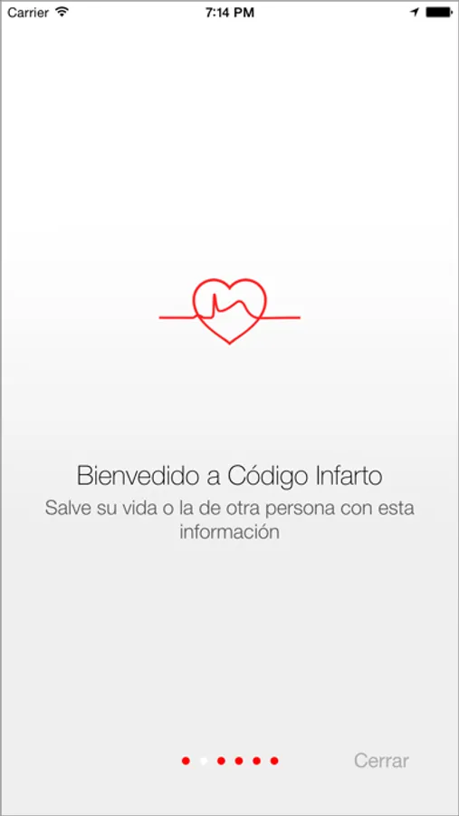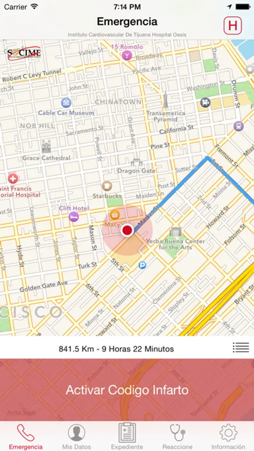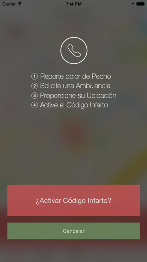 an infarction. Chest pain does no always relate to an infarction, but it’s very important to arrive promptly to an adequate hospital for medical evaluation. Do not wait more than 5 minutes to ask for help. By only pressing the “Activate Código Infarto" button you will be connecting to the ambulance service of the chosen hospital.