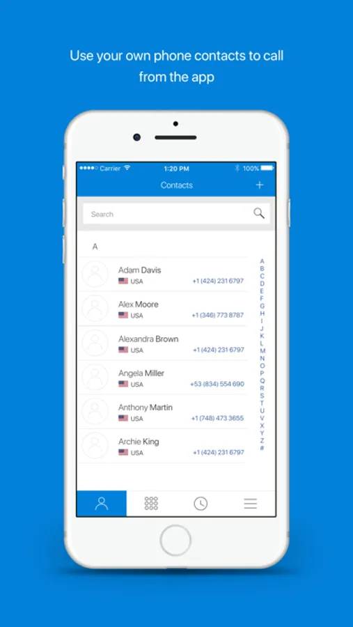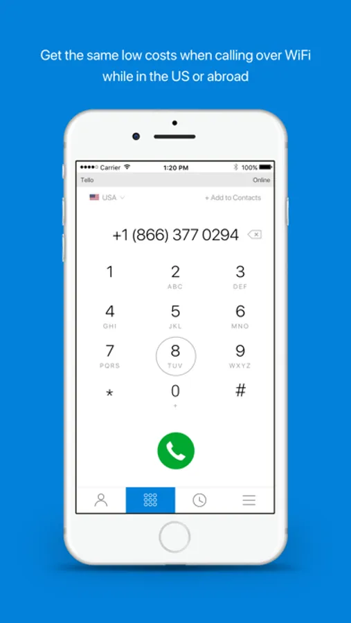 Use the app in the US while connected to the Tello network or over WiFi. When travelling in US or abroad, call over WiFi using the same balance. This way you can still carry your phone number anywhere in the world and enjoy the same low costs.