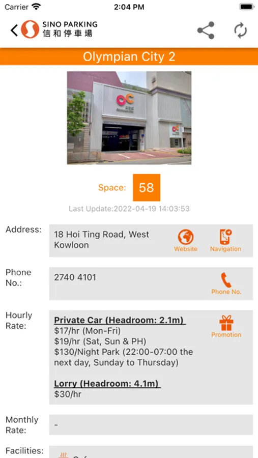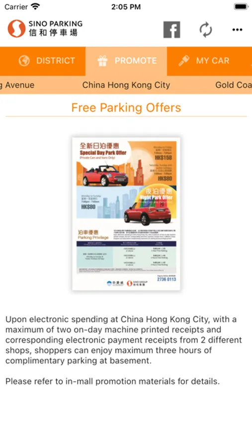 'Sino Parking' is a multi-function application for drivers to access to information such as navigation, parking rate and promotion of the car parks operated by Sino Parking Services Limited. Established in 1987, Sino Parking Services Limited is one of the largest and most experienced car park operators in Hong Kong with more than 110 car parks and around 17,000 parking spaces under management. The copyright of this App is reserved by Sino Parking Services Limited (Copyright reserved. All rights reserved.)