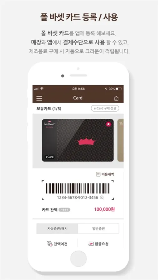 iOS 애플리케이션을 통해 Paul Bassett Society를 언제 어디서든지 편리하게 이용하실 수 있습니다. 모바일 주문, 카드 충전, 카드 등록, 이용 내역 조회 등 모바일 환경에 최적화된 UI가 적용된 애플리케이션으로 더 편리하게 이용해보세요. 이제 모바일을 통해 쉽고 빠르게 주문, 충전 및 결제하시고, Crown 및 쿠폰도 확인하실 수 있습니다.