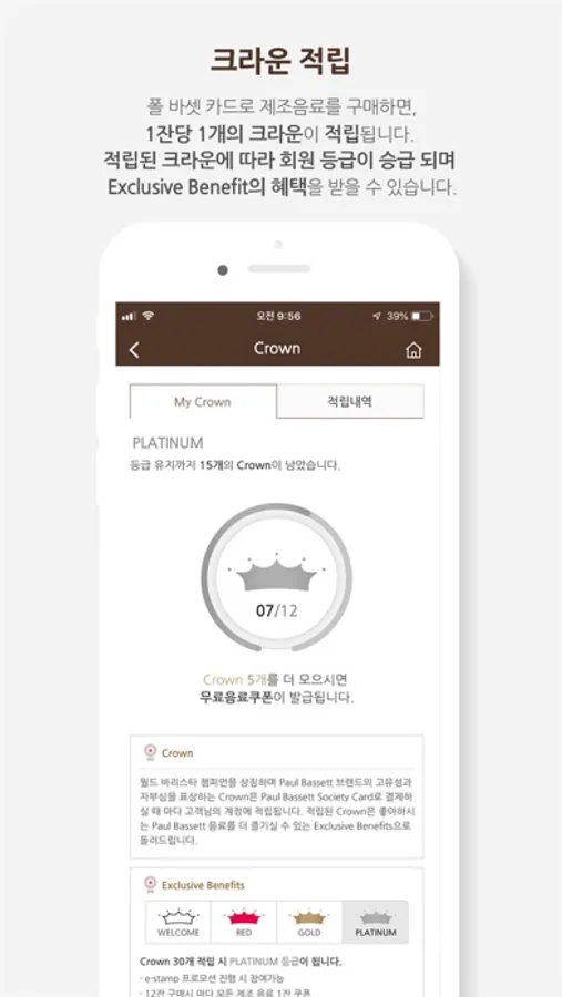 월드 바리스타 챔피언을 상징하며 Paul Bassett 브랜드의 고유성과 자부심을 표상하는 Crown은 등록하신 Paul Bassett Society Card로 결제하실 때 마다 고객님의 계정에 적립됩니다. 적립된 Crown은 좋아하시는 Paul Bassett 음료를 더 즐기실 수 있는 Exclusive Benefits으로 돌려드립니다.