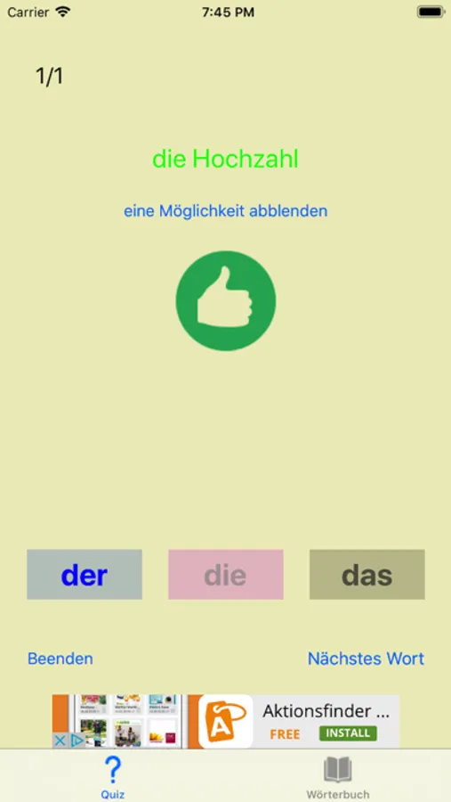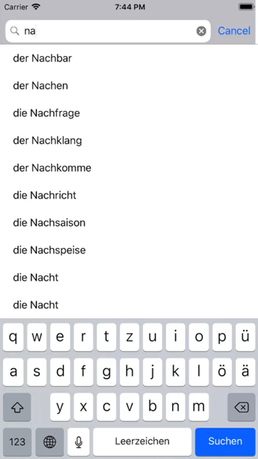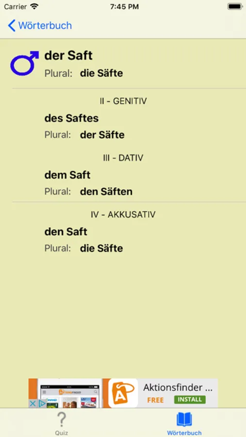- You can look for a word, like in a dictionary and the app tells you the article, the plural form, and some example-sentences for Dativ, Akkusativ and Genitiv cases.