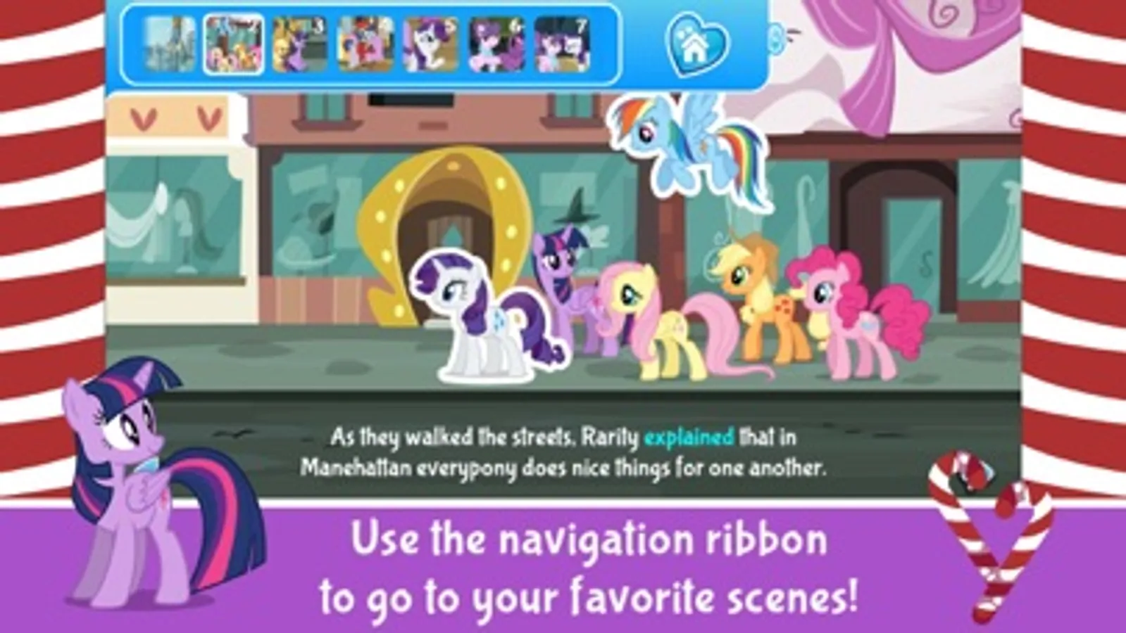 Based on a popular episode from the hit animated series MY LITTLE PONY: FRIENDSHIP IS MAGIC, this whole new kind of interactive storybook app features 18 pages of story, iconic characters, television-quality animation, and interactive dress-up activities perfect for early and emerging readers AND your MY LITTLE PONY fan!