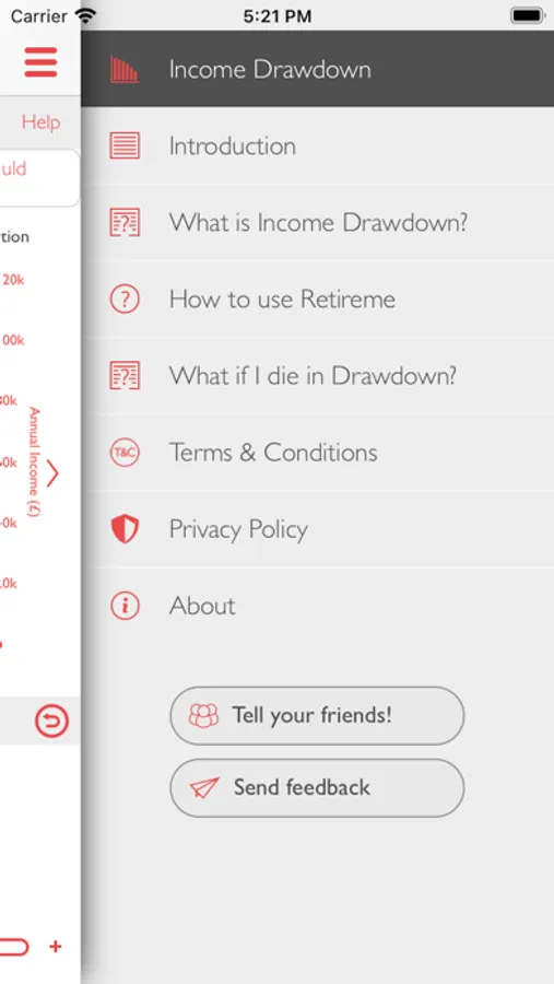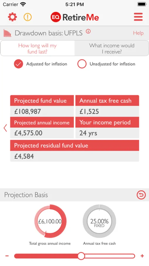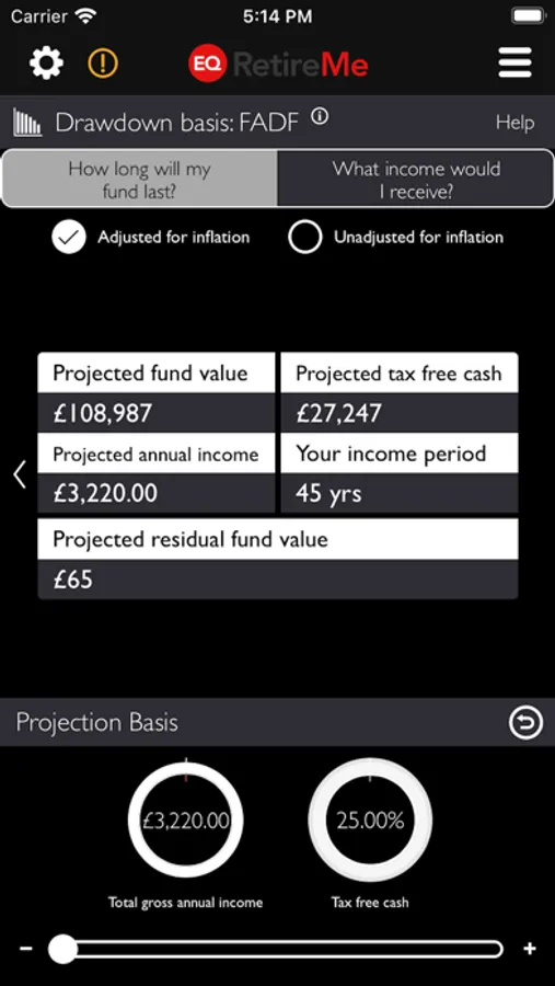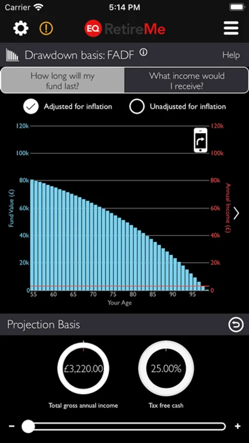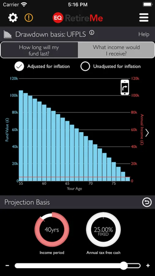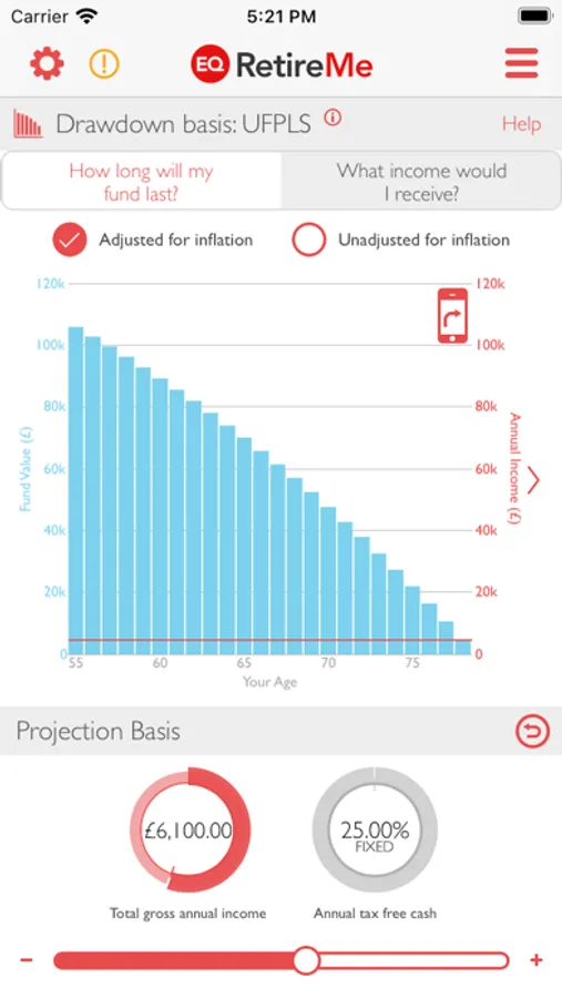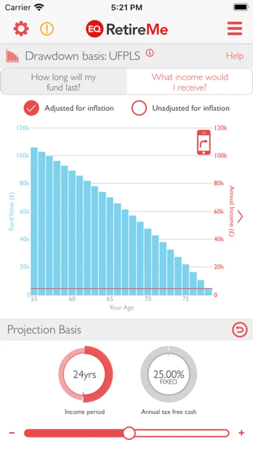 The results are displayed as a graph showing your projected drawdown income and projected fund value over the period of drawdown. You can also see your projected values by swiping left in the graph area.