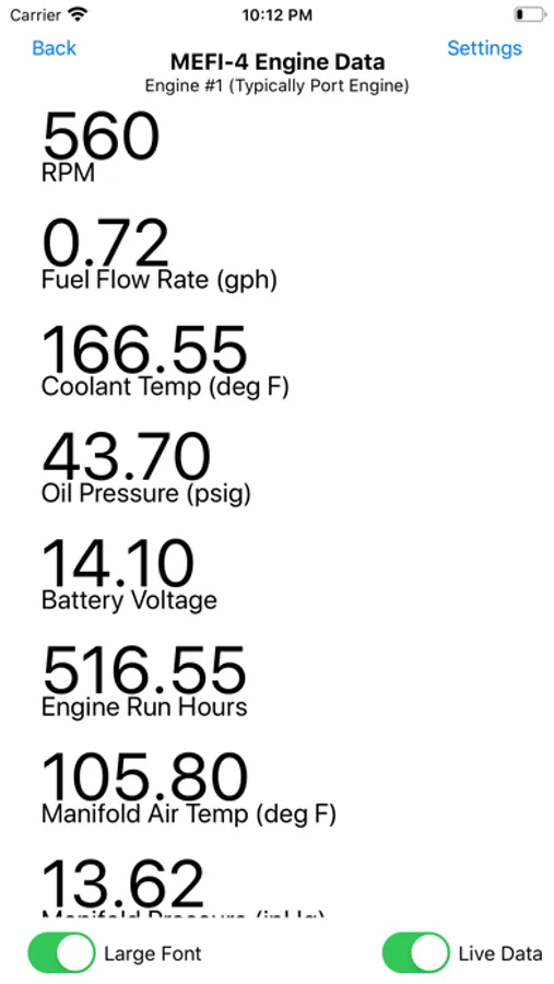 Engine data is viewable in table (list view) format with options for either normal font or large font size.
