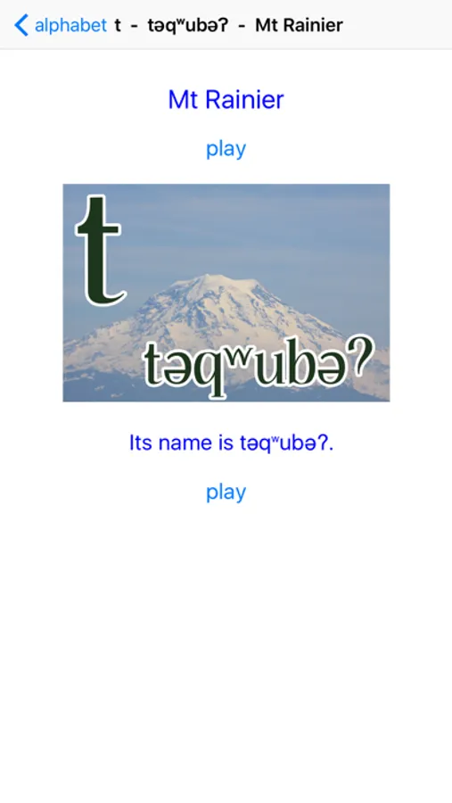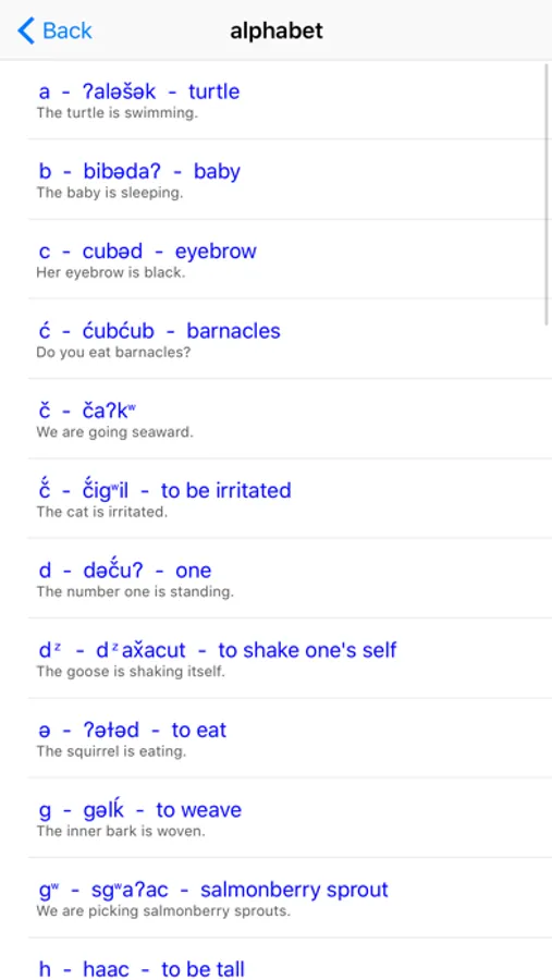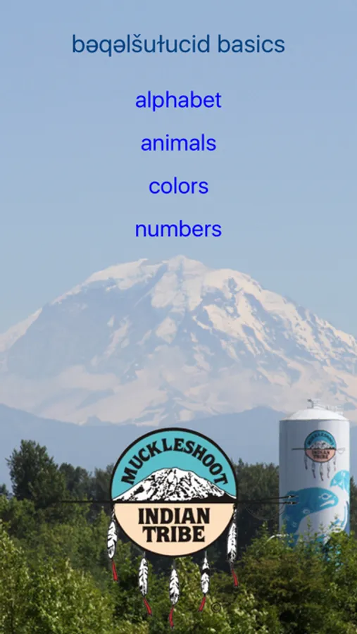 This is the Muckleshoot Basics App. It offers words and phrases in the Muckleshoot dialect of the Lushootseed language. They are arranged into four categories: alphabet, animals, colors and numbers.