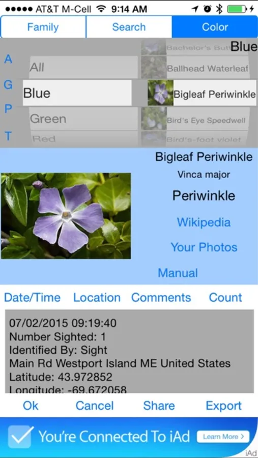 Export your sighting (or a subset) to another device with Wildflower Journal installed. Ideal if you use an iPhone in the field and an iPad at home or if you're sharing lists among family and/or friends.