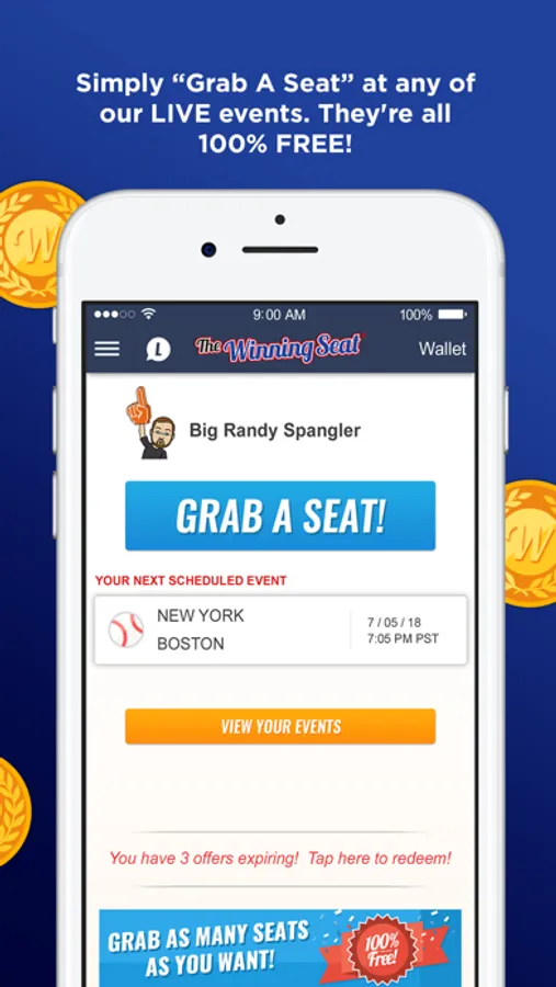 The Winning Seat® is the ONE AND ONLY Mobile Live-Action Sports Sweepstakes App where users PLAY 100% FREE to WIN CASH & PRIZES! Whether you're at the live event or watching from home, you can pick from any of our live events and "Grab A Seat" for a chance to win. Grab as many seats as you want! There is no limit and they are all 100% FREE!