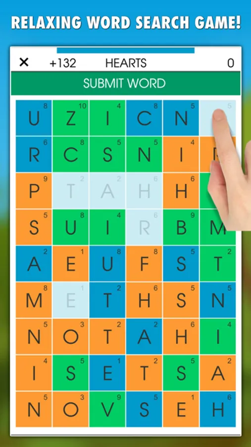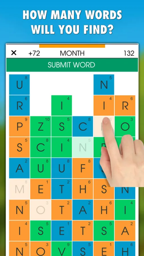 There will be shown 54 letters on the screen - tap on them to create words with 3-10 letters! Each letter has its own points and color, try to match the color of the first letter in your word to get extra points! There will be shown a SUBMIT WORD button if the word exists, press it to submit the word and to receive the points! To erase the word just tap on any already selected letters! To erase the last letter only, just tap on your created word at the top of the screen. You can submit your score whenever you want by pressing the X button in the top left corner. Get the best score possible!