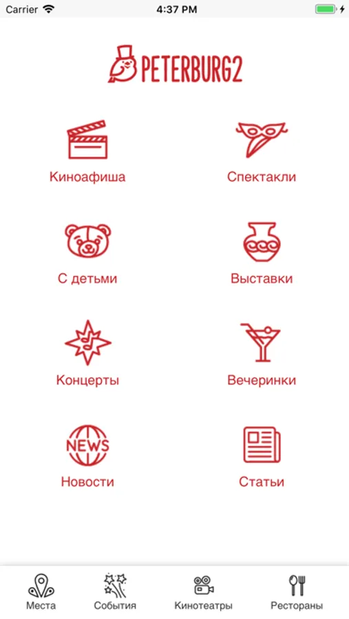 Приложение крупнейшей афиша Санкт-Петербурга - Петербург2.ру. Все сервисы и материалы сайта: киноафиша СПб, кинотеатры Питера, театральная афиша и репертуар спектаклей, концерты в Петербурге, выставки, музеи, клубы, события в городе и Ленинградской области, детская афиша и куда сходить с ребенком, рестораны, места, ярмарки и концерты. Места и события с бесплатным входом.