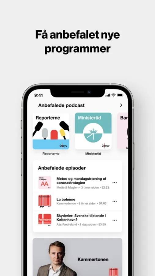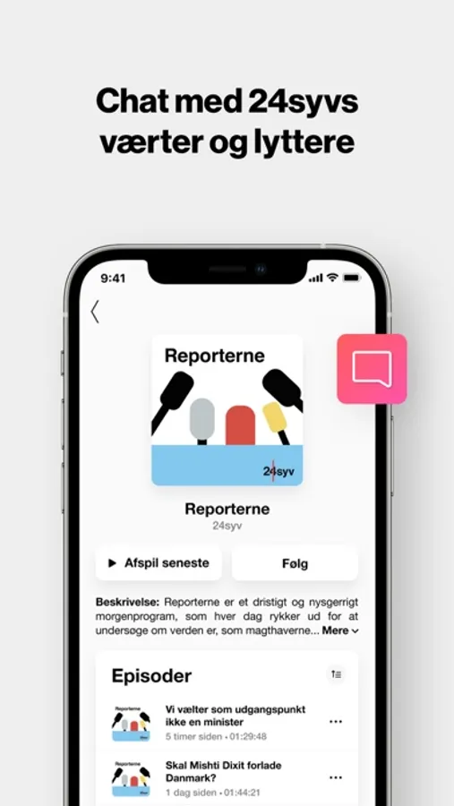 Prøv også vores nye chat-system, der giver dig direkte adgang til vores værter. Gennem chatten kan du sende input, spørgsmål og kommentarer både før, under og efter udsendelserne. Du finder chatten ved at trykke på programsiderne, der ligger som karruseller på appens forside.