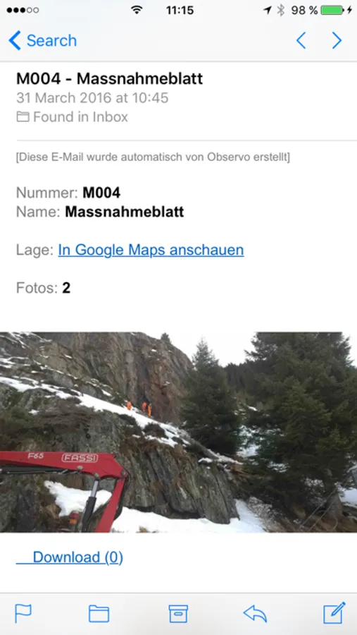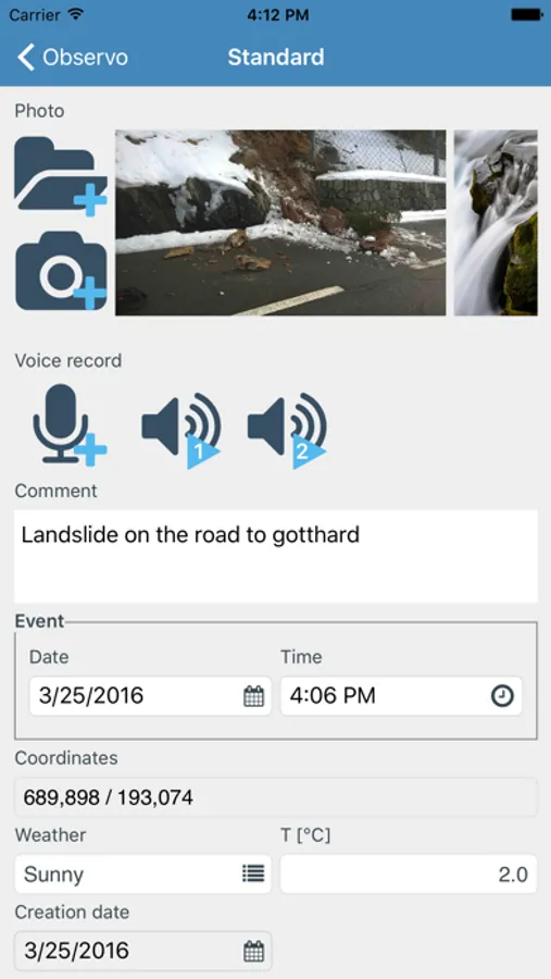 In addition to generic observations (photos, voice record, text) multiple and customizable forms can be defined according to your daily tasks. A simple tap on a button will allow you to send your data per email to a configured location for a further processing. Your data will be formatted and displayed within a resulting report (incl. photo and map extract).
