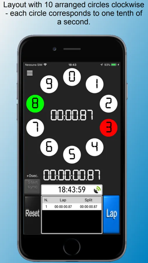 4. Layout with 10 arranged circles clockwise - each circle corresponds to one tenth of a second.