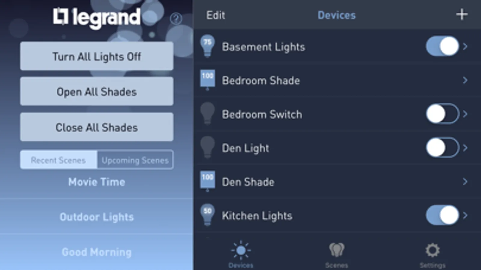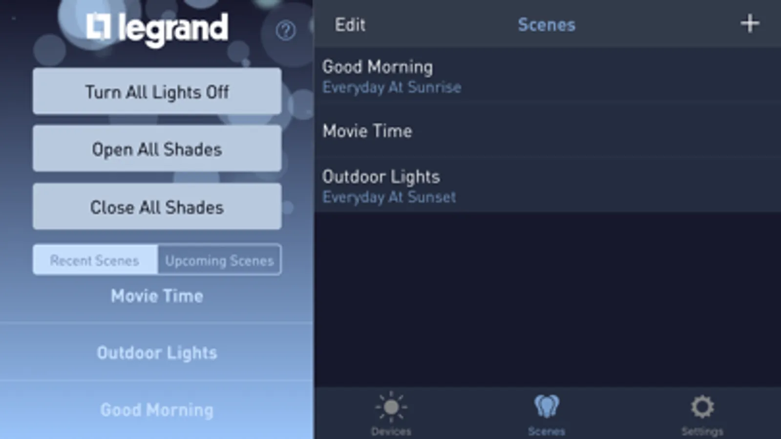 Scenes allow you to customize, schedule, and automate groups of devices to enhance the comfort and convenience of your home. Create the perfect dimming level for movie time, or automate your outdoor lights to turn on at sunset and off at sunrise.