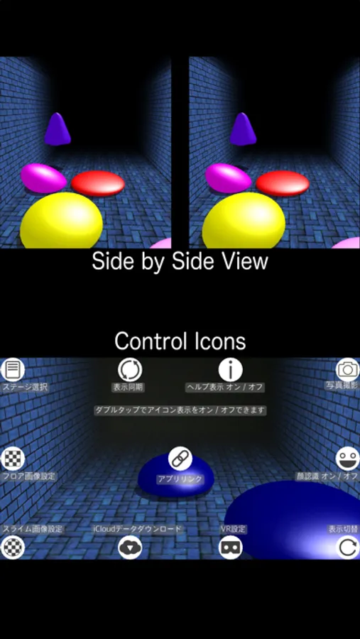 You can switch to side by side mode by tapping switch icon(right bottom icon). And you can watch slimes in 3D using a VR box for iPhone.