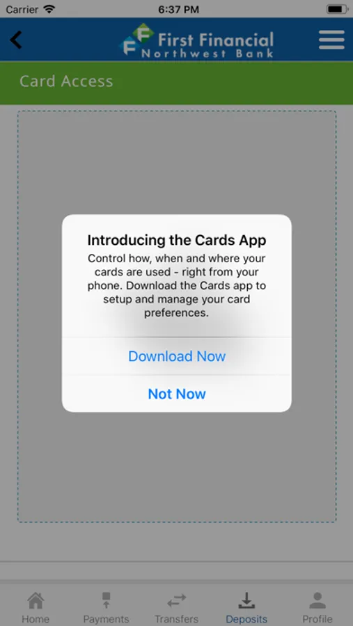 • FFNWB Card Access: - Control your First Financial Northwest Bank Debit Card by turning it on and off, setting spending alerts, and even location-based alerts!