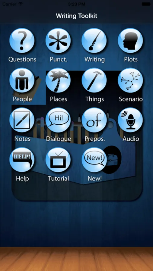 The third row has Notes, Dialogue, Prepositions and iPod Control. The Notes section allows you to jot down ideas for your work from anywhere. The Dialogue section provides you with a list of over 100 words that you can use in place of 'said' so your dialogue remains vibrant and fresh for your readers. Additionally, they are tagged for indicating loud, normal, questioning or softly spoken speech. The Prepositions section provides you with a list of 133 prepositions for when you need them. The iPod Control section allows you to listen to your own music or audiobooks without leaving the application.