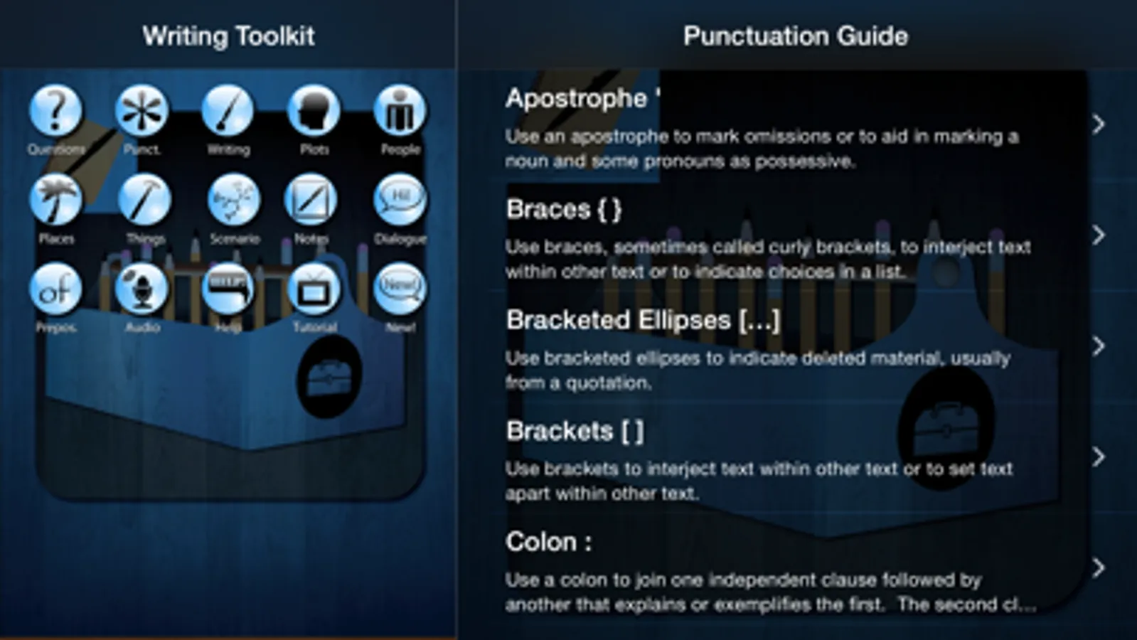 Welcome to Writing Toolkit! This application is intended for writers of all genres; fiction, nonfiction, technical and more! This app will help spark your creative fires whether you are an savvy writing veteran or a wet-behind the ears newbie. This app is for you!