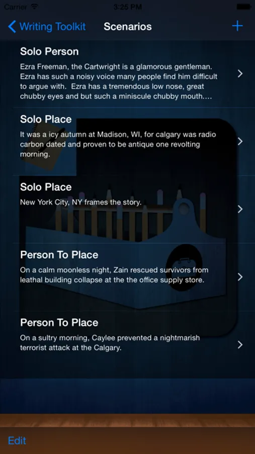 The second row, containing People, Places, Things and Scenarios, constitute the section of the application that helps you create new characters, places, important items and interactions between them. These items are interdependent. Namely, to create a new scenario between people, places or things, you must first create people, places or things. This section is designed to produce endless variations for you to read through and pick the ones you like. Further it can help inspire you to create alternatives to the suggested scenarios, people, places and things. So, if you are looking for a new character, generate one. If you are looking for a new setting, generate one. You get the idea.