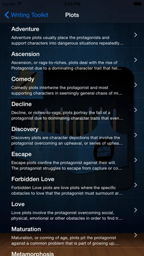 The top row, including Questions, Punctuation, Writing Definitions and Plots, showcase the features of the application which aid you in your writing mechanics and creativity. They present you with thought provoking content, notation and email features. The Questions section is separated into categories and the questions in each are designed to help you break through a writer's block. The Punctuation section offers a guide to punctuation use. The Writing Definitions section provides you with definitions for common writing concepts. The Plots section gives an overview of 25 different plot types with examples of each. These plot types encompass all of the standard storytelling plots.