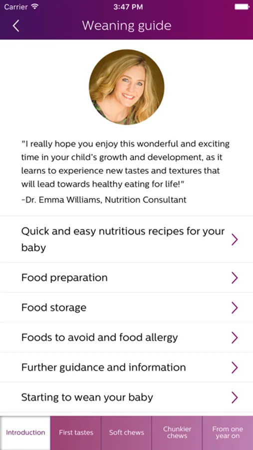 We understand that nutritious food is essential to your baby's healthy development. With the help of child nutritionist Dr. Emma Williams, this app offers professional weaning advice, along with tasty, fresh cooked recipes and meal ideas to help you give your baby a healthy start in life and to set good, lifelong eating habits.