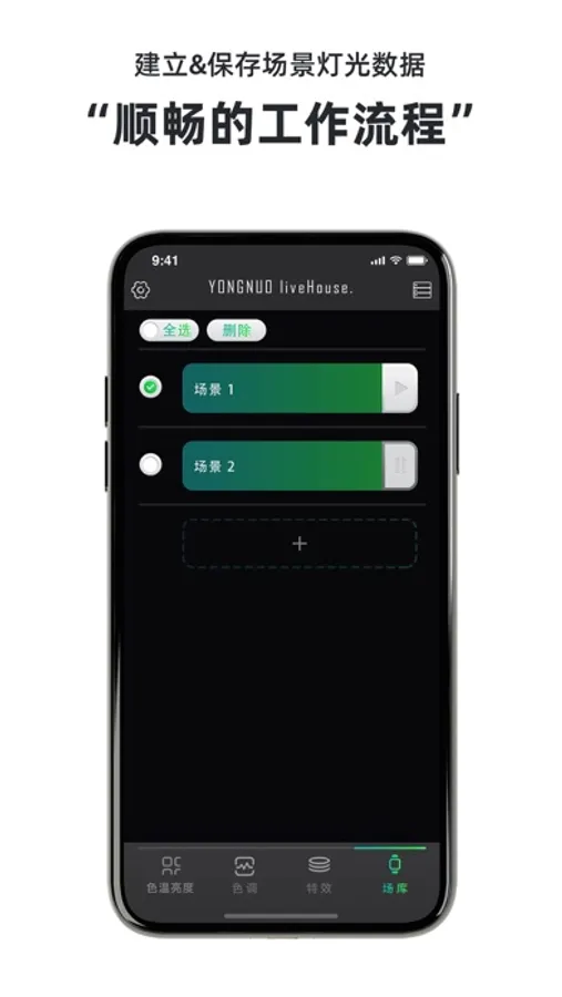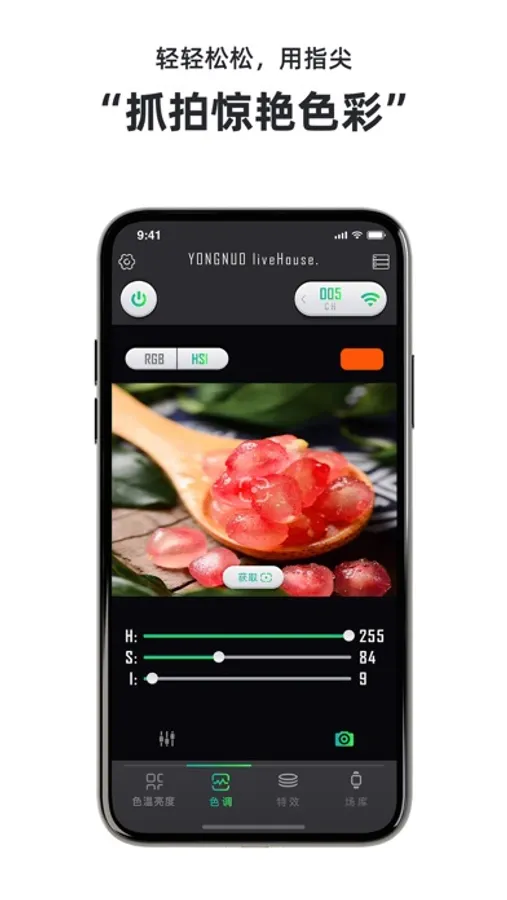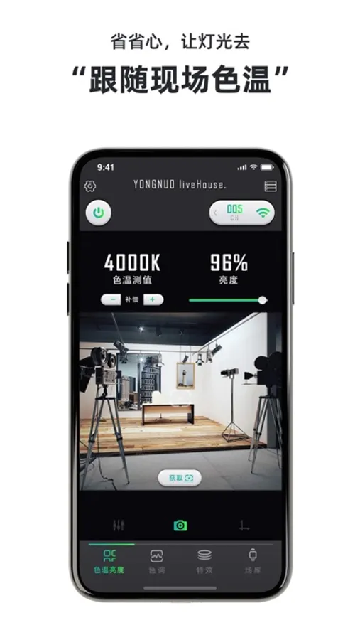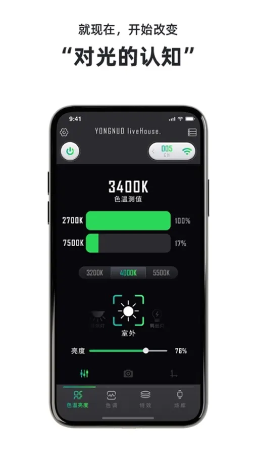 YONGNUO集成了摄像灯专业的控制功能和模式,主要由基础模块,色温模块,彩色模块,特效模块,场景预设构成,帮助灯光师、摄影师,视频制作人员快速完成场景布光。