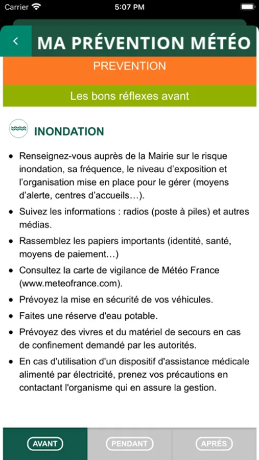 - D'accéder à des conseils de prévention pour bien agir avant, pendant et après un risque hydrométéorologique (inondation, submersion marine, tempête et forte chute de neige).
