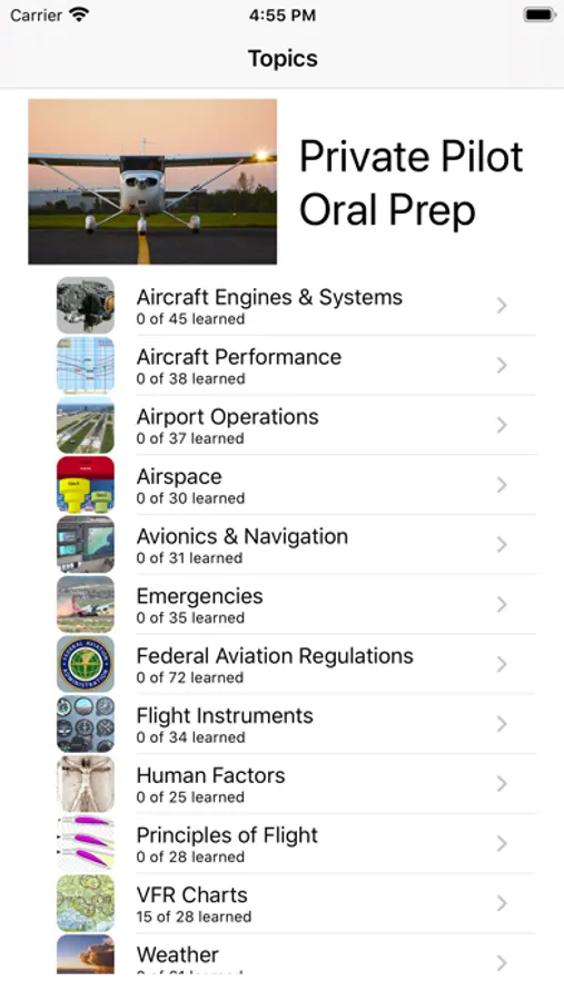The topics included are aircraft engines & systems, aircraft performance, airport operations, airspace, avionics & navigation, emergencies, federal aviation regulations, flight instruments, human factors, principles of flight, VFR charts and weather.