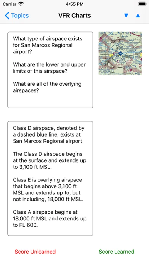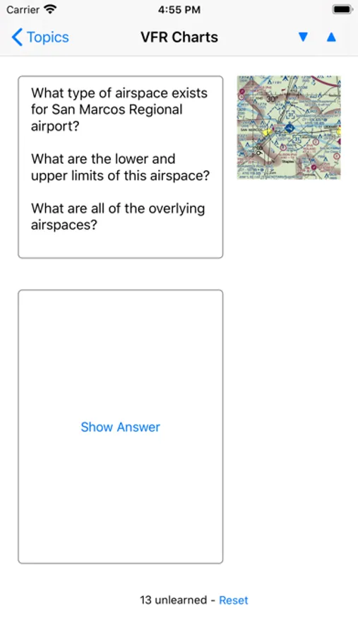 Questions are presented in flashcard style. Graphical images are provided when needed. When the student views the suggested answer, they can indicate if they answered satisfactorily or if they would like to review the question again. Learning all of the questions allows the student pilot to be prepared and confident for the FAA Private Pilot Practical Test for Airplane.