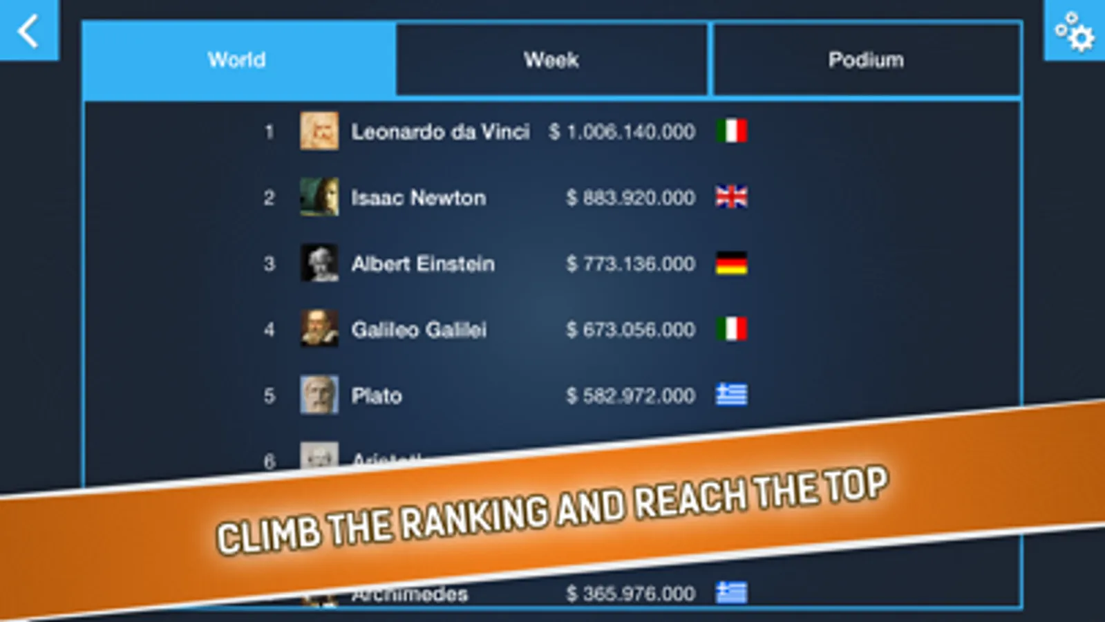 * Podium: top three players of each week.