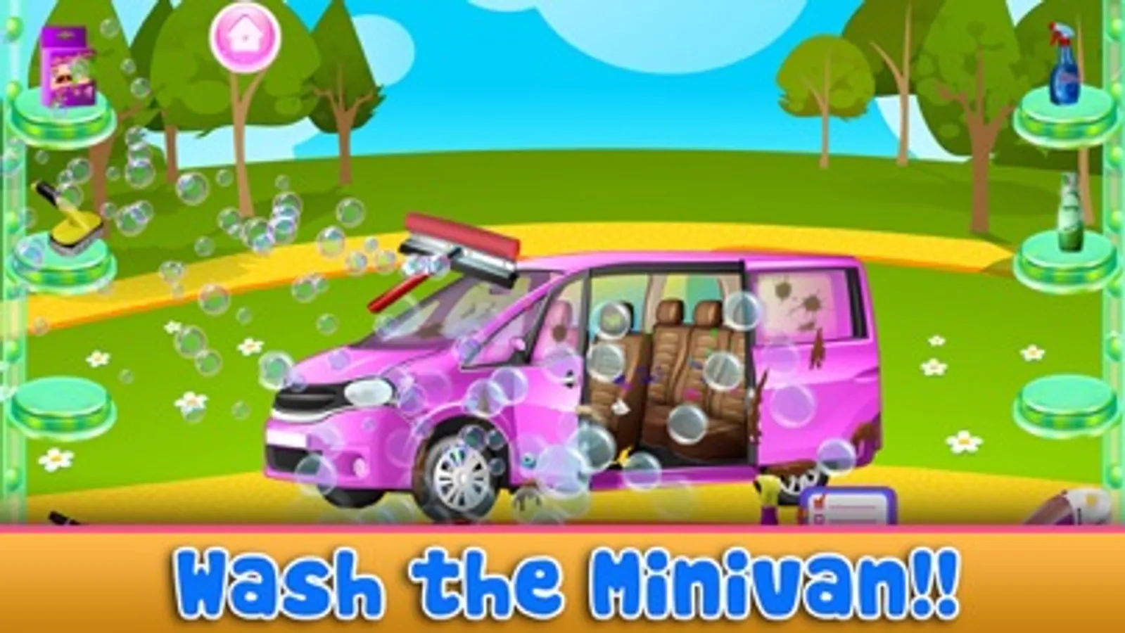 Level 4: Clean up the pink family mini-van!! Use the cleaning tools to get rid of the mess inside the van! Clean the windows with the squeegee and much more!