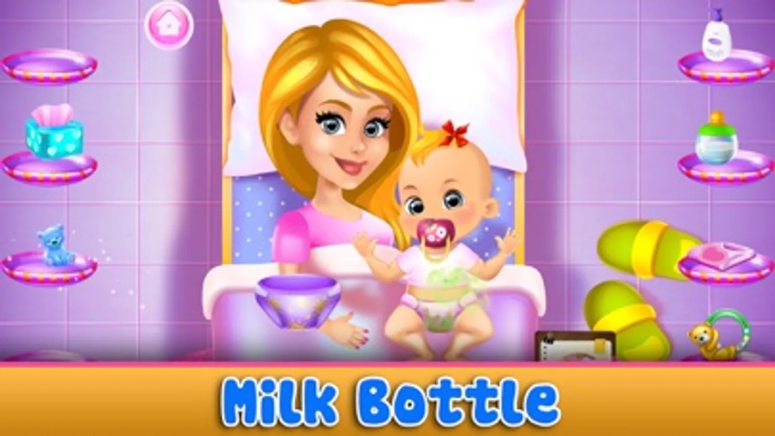 Level 6: Give the baby a milk bottle & a binkie so she will be happy! Have fun as you play with rattle toy and change the old diaper!