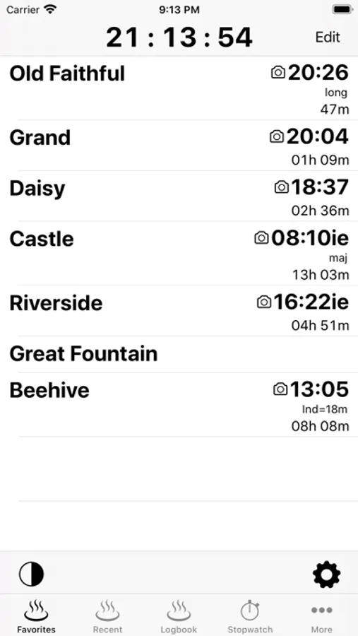 Optionally, predictions, when available, can be displayed for certain geysers. Notifications for window opening times can also be added. Notifications can also be requested for the eruptions of specific geysers, although this does not use Push Notifications and so isn't always timely.