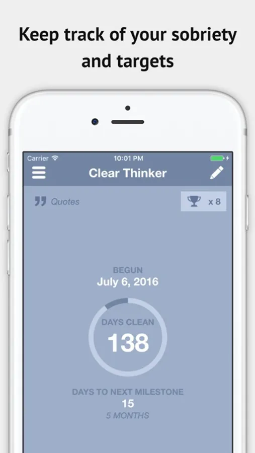 Clear Thinker is an app dedicated to help anyone achieve and maintain sobriety. Clear Thinker is a motivational tool to help you on your path to sobriety. It is a simple and intuitive tool that helps to keep you motivated and on track.