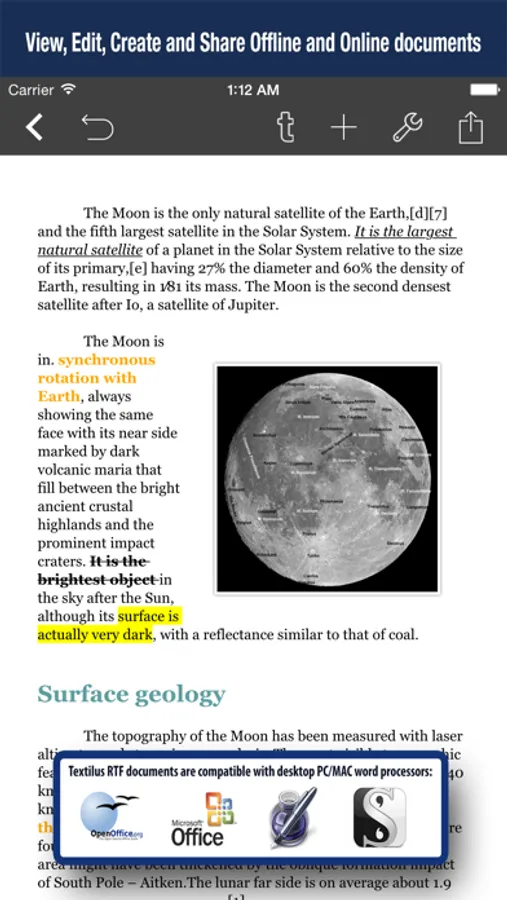 + Create, edit, import and export text, RTF, Markdown and LaTeX documents.